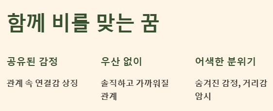 다른 사람과 함께 비를 맞는 장면은 관계 속 공유된 감정을 나타냅니다. 함께 감정을 겪거나, 같은 감정 상태에 있다는 연결감을 상징해요.
